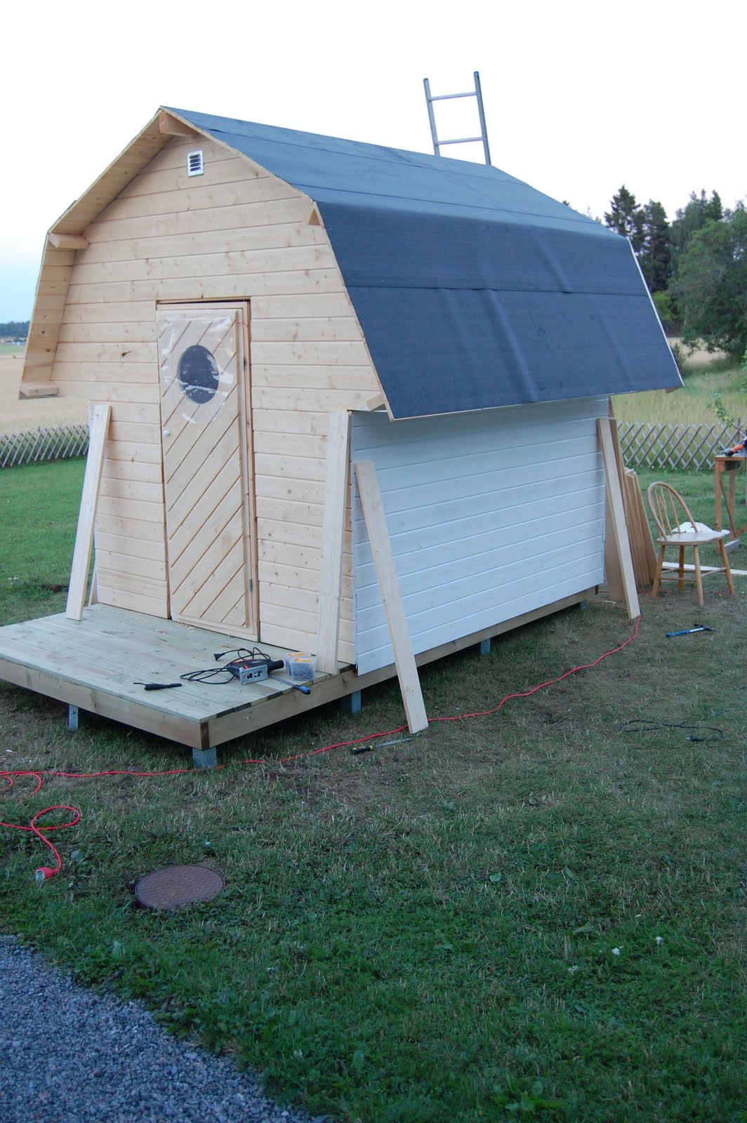 Det har varit lite regniga dagar på sistone, och lekstugebygget har väl inte precis rusat framåt. Men lite har ändå blivit gjort, bland annat har jag målat första varvet med grå fasadfärg och grundat stugan invändigt.